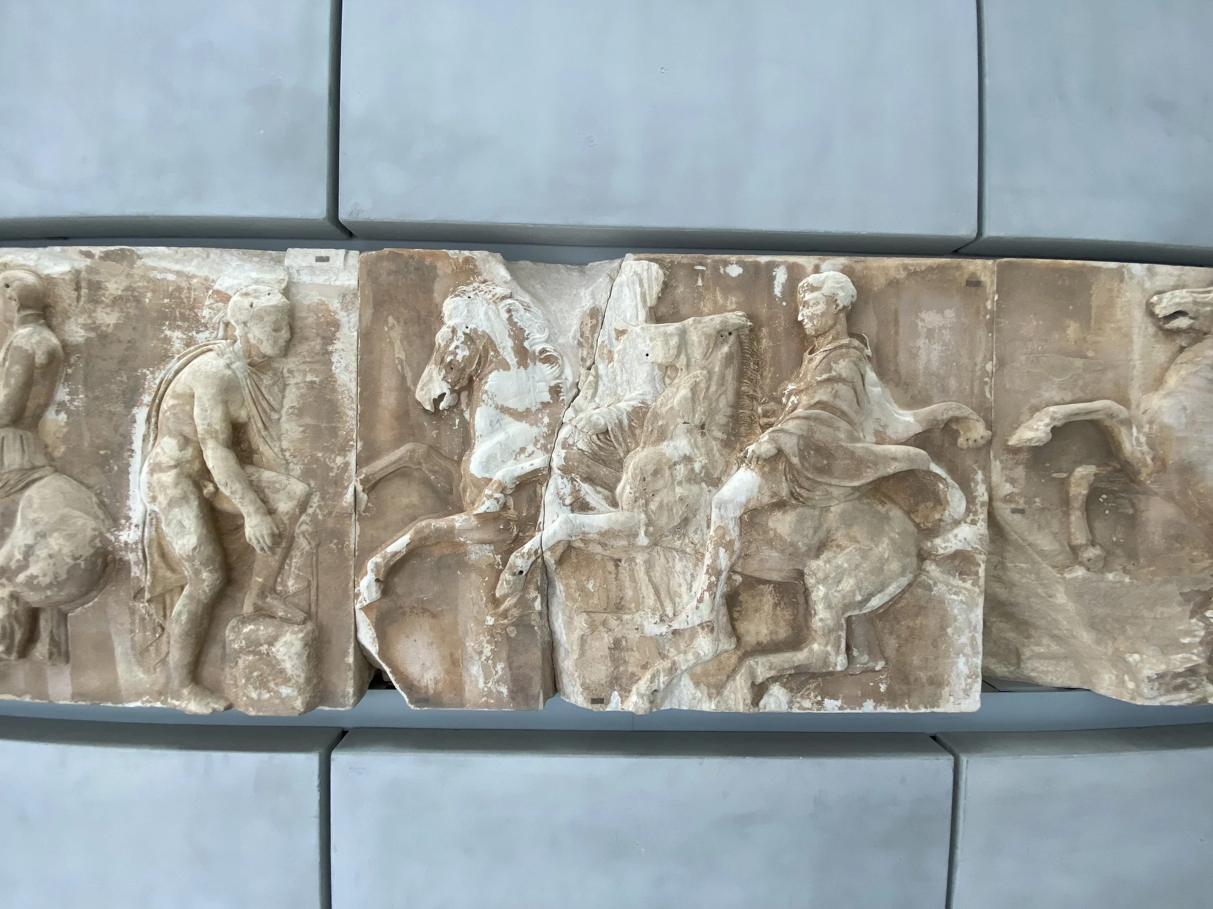 Every museum, so far in Greece, had been laid out with the upmost of thought, with the architecture being as much about the experience as the artifacts and the whole presenting a narrative. In this case, you climb as if ascending the Acropolis with the artifacts reflecting this climb as they be come increasingly secured the higher you go. In the end, you ascend to the upmost point of the Parthenon where you see the marbles eye to eye with those depicted in the art. All the while looking out the glass walls upon the city scape of Athens and up to the Acropolis.