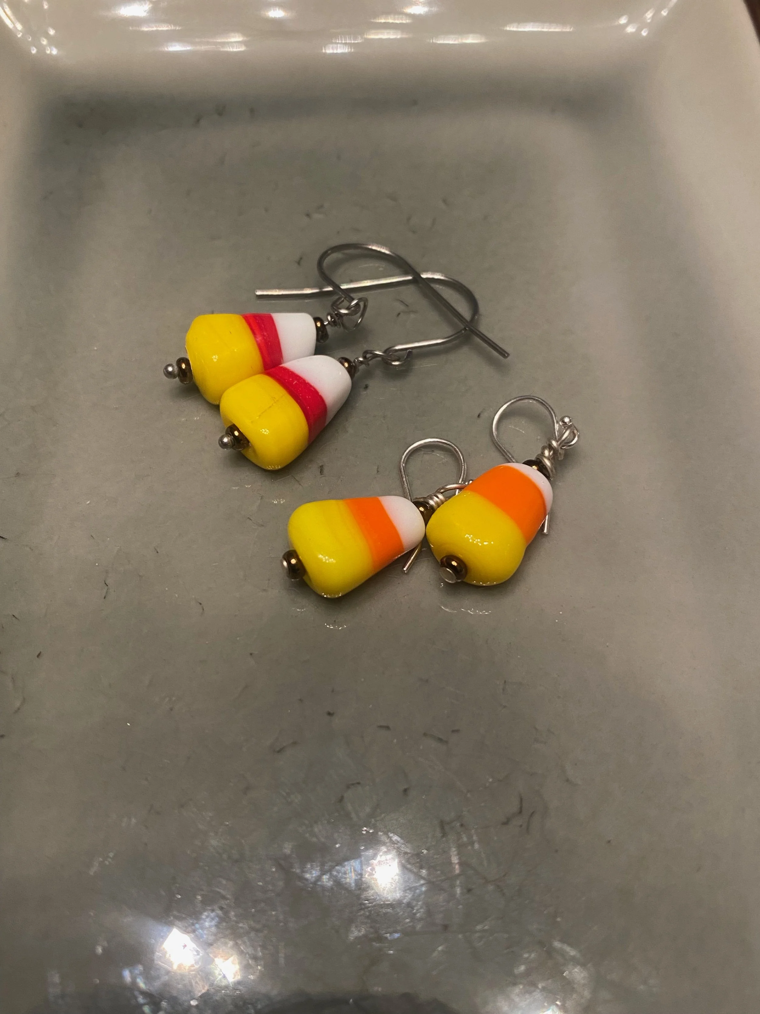This 19 ½ inch necklace is made with Lamp work beads shaped like pumpkins as well as glow in the dark beads. The Glow Glass Glows purple.. The piece is strung on stainless steel and finished with stainless steel findings.