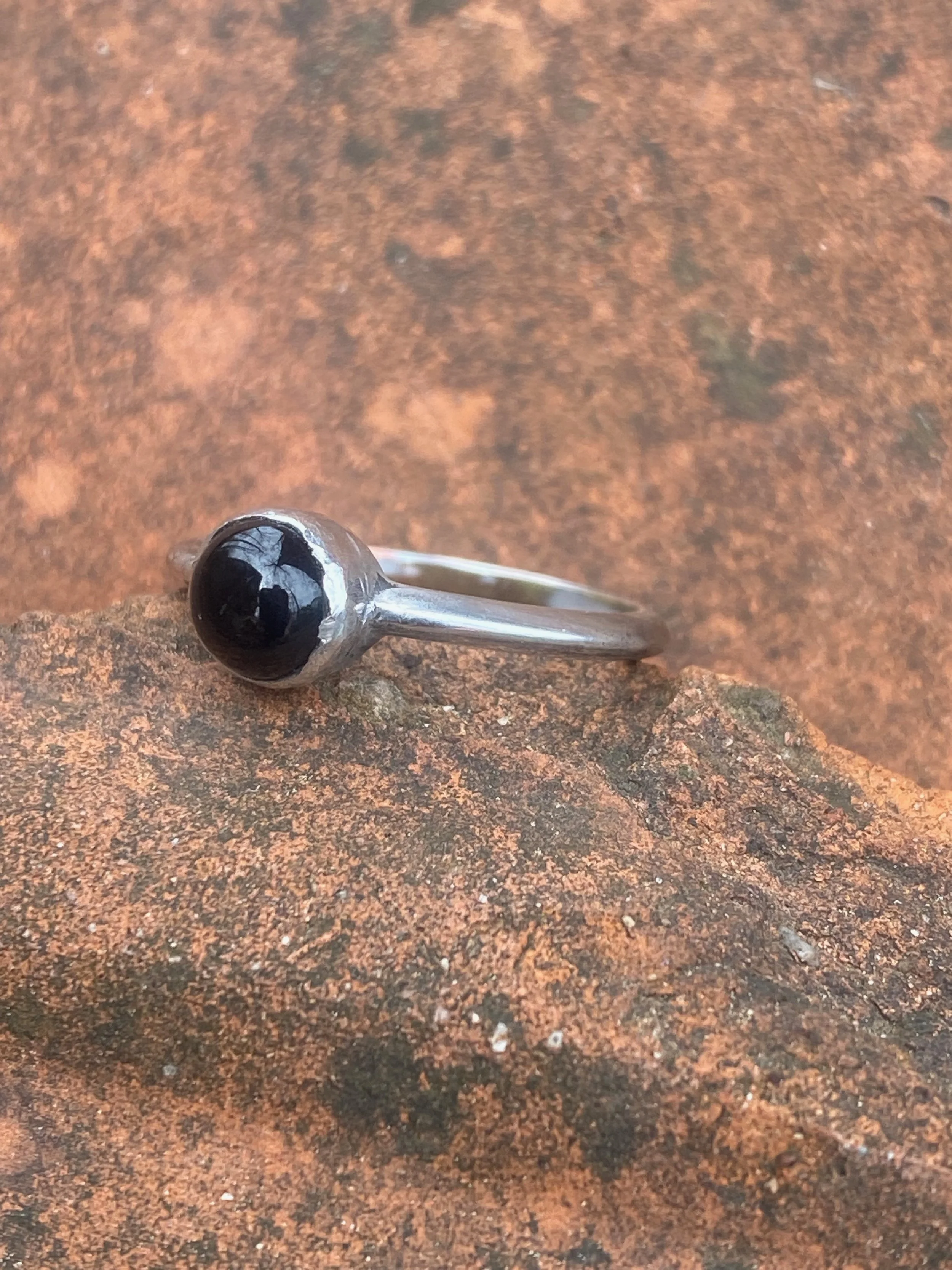 These size 6 3/4 rings are have a bezel set cab. The rings are marked .925 and are made of sterling silver. The rings weigh 2.1g to 2.2g. They are just smaller than a size 7. I am still learning to set cabs and these are definitely not perfect.