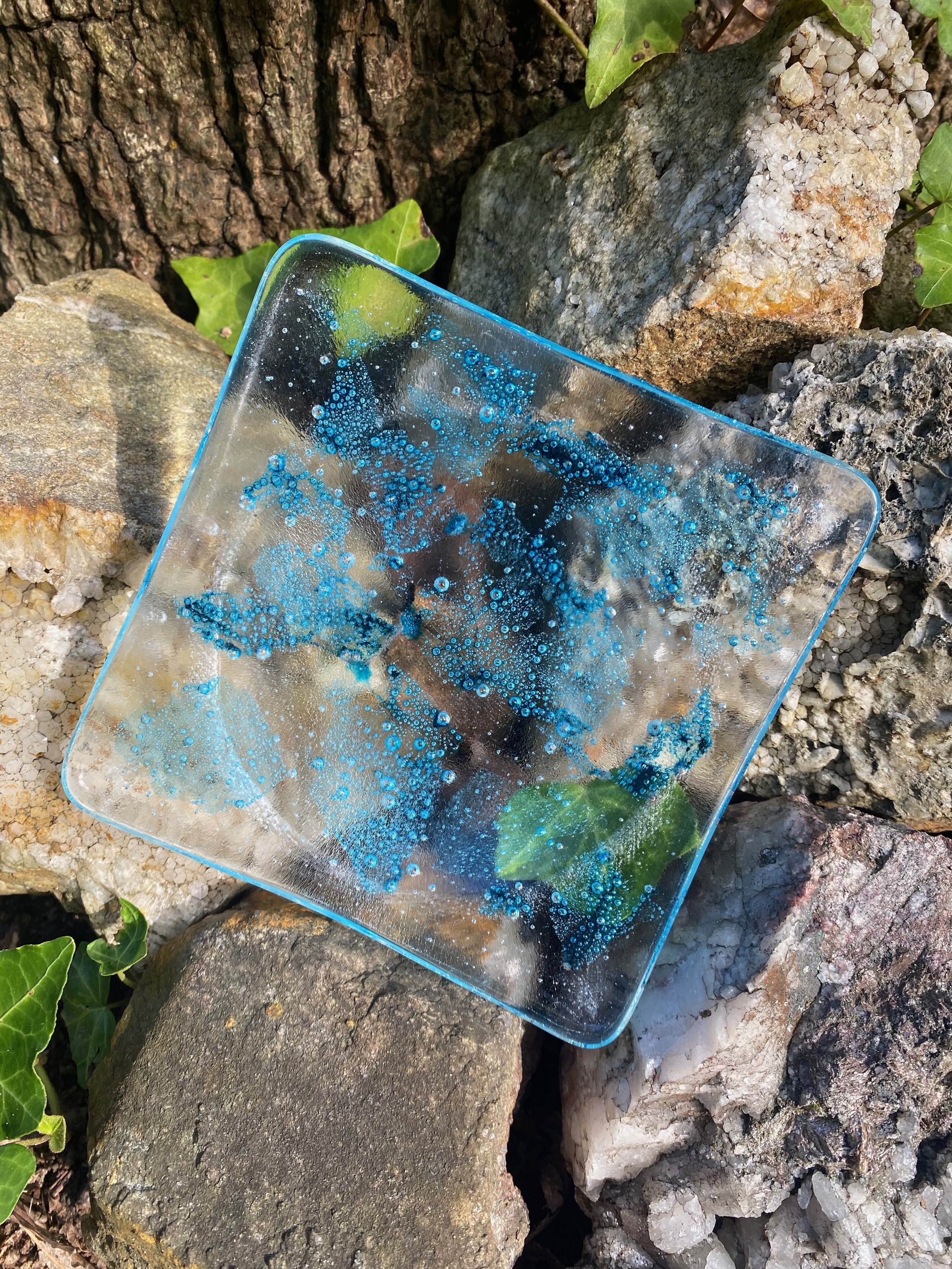 This Plates are made of fused and slumped glass. The are inspired by my trip to ice land representing lava and ice. The glass used is COE 90 Bullseye. The glass is cut, then fused in a kiln before being slumped. It takes two full days to make each item. The glass is 6mm thick. The coaster is 5 inches by 5 inches with a 1/2 inch deep center.