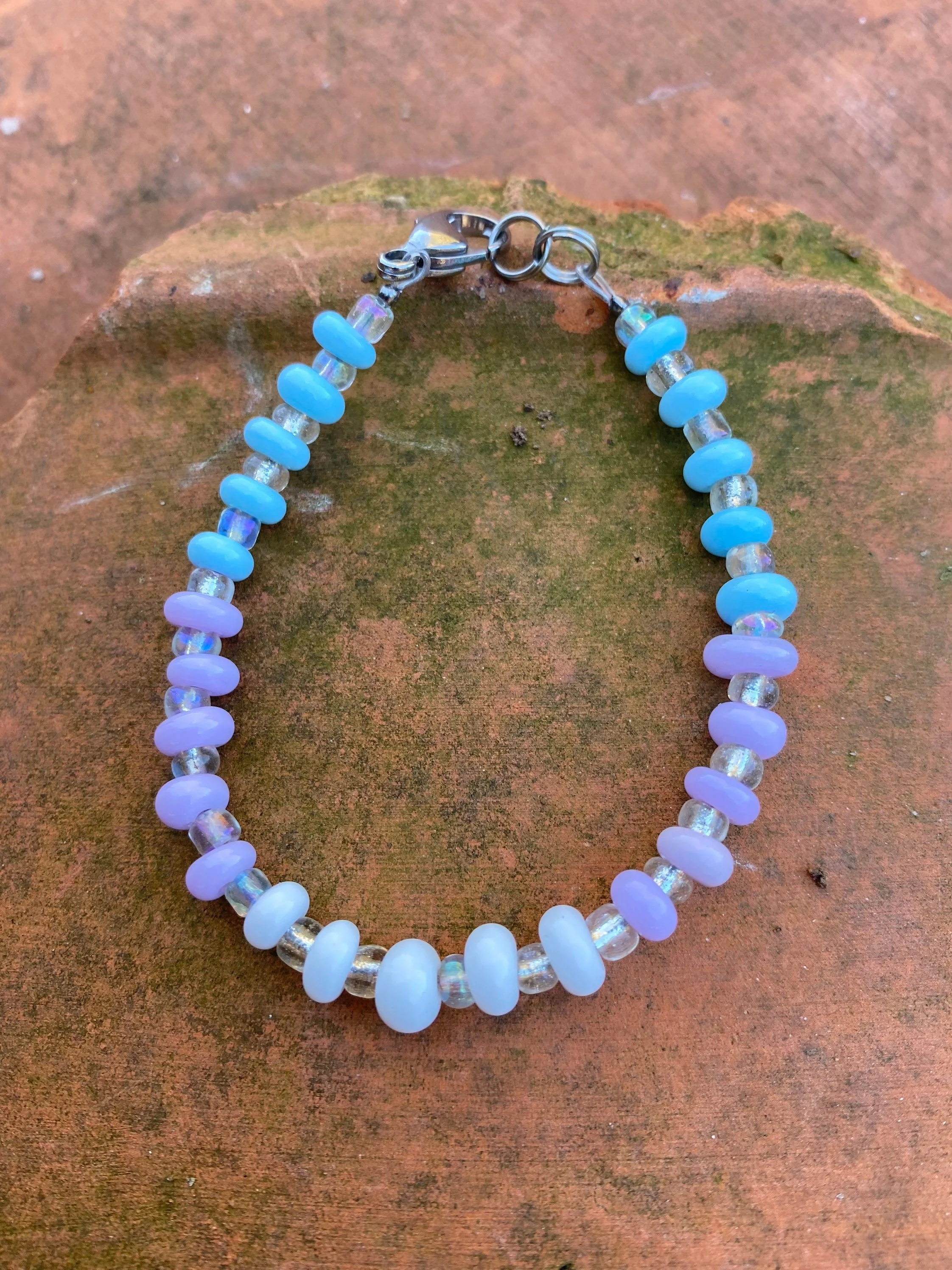 This 7 1/5 inch transgender pride bracelet is made with handmade lampwork beads, and seed beads. It is strung on stainless steel wire with stainless findings.